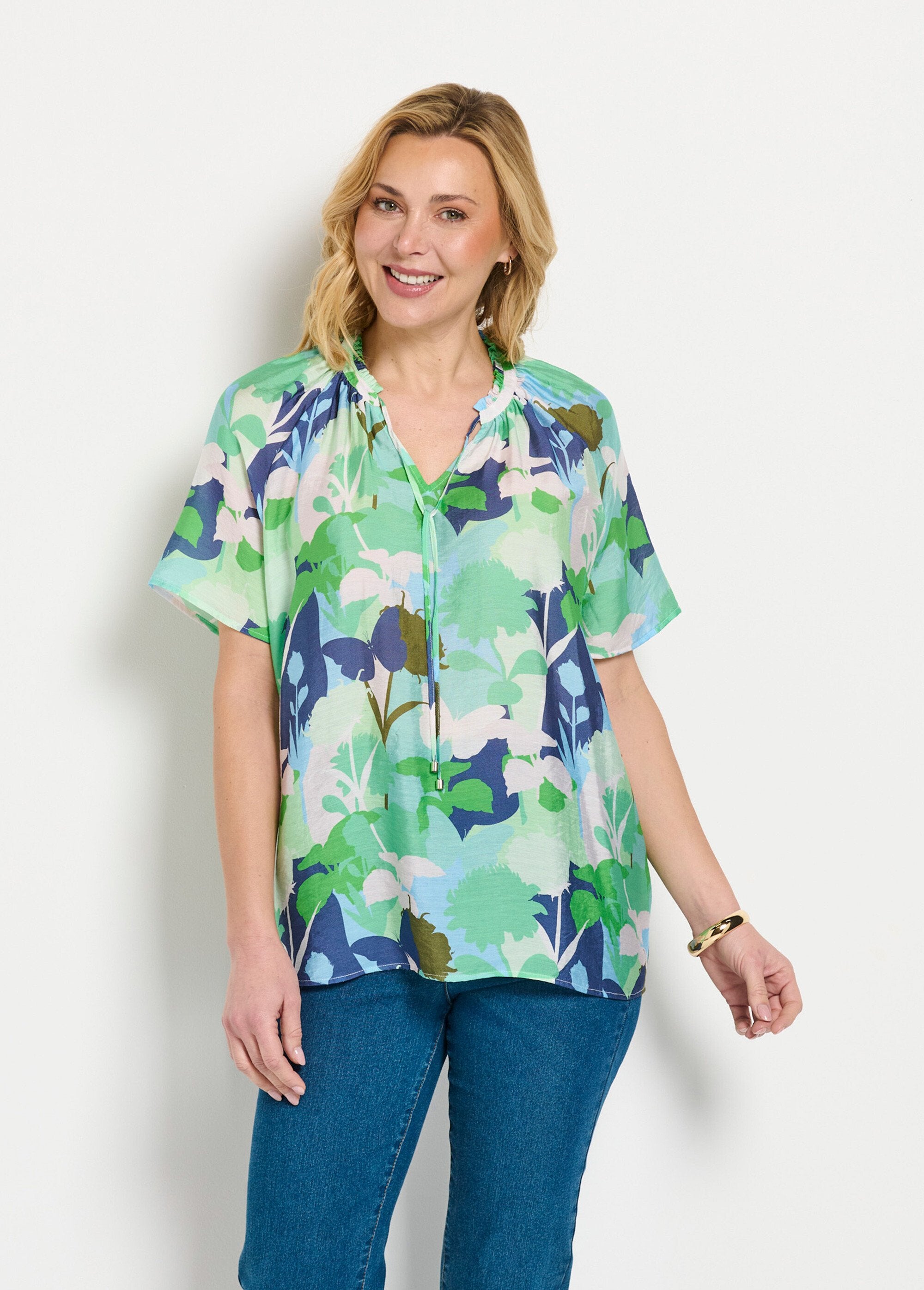 Long_tunic_with_floral_voile_and_ruffled_V-neck_Blue_and_green_FA1_slim Long_tunic_with_floral_voile_and_ruffled_V-neck_Blue_and_green_DO1_slim